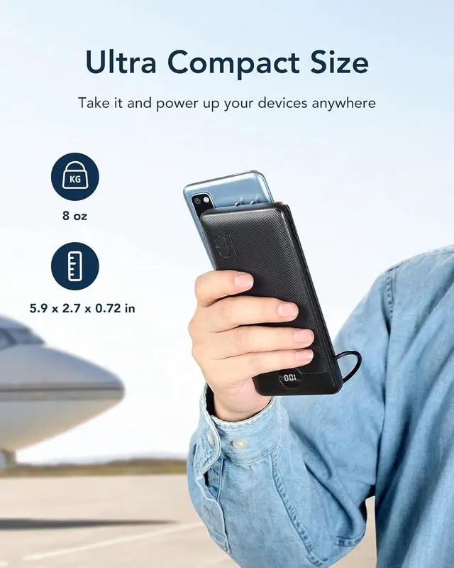 10000mAh Capacity with Slim Body: With a slim size of 5.9 x 2.7 x 0.72 inch size, 8oz weight, the external battery is a perfect travel accessory. Full 10000mAh Capacity is enough for daily used, which provides charges 1.8 for iPhone15/14, 1.6 charges for Samsung S23.