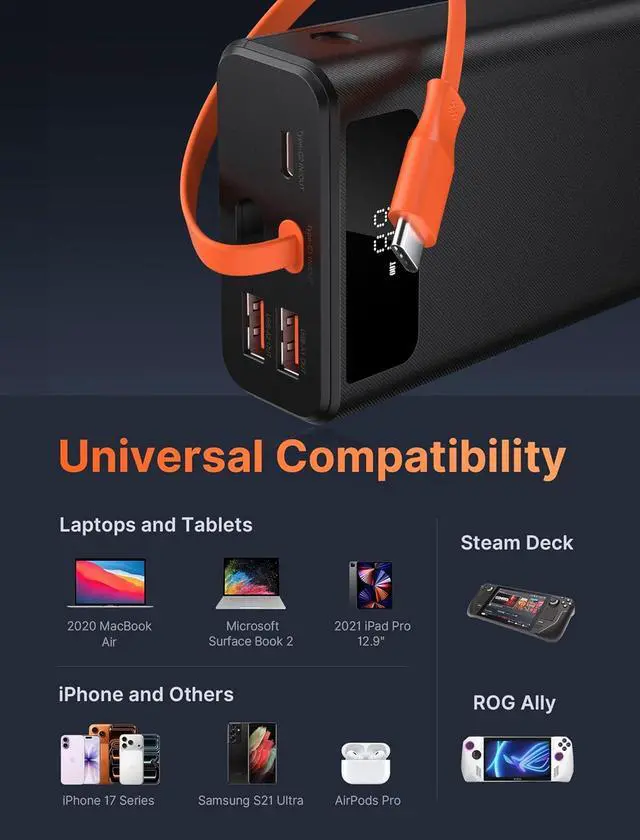 Universal Compatibility: Compatible with a wide range of USB C PD devices, Compatible with iPhone 17/17 Pro/17 Pro Max/Air, iPhone 16/16 Pro/16 Pro Max/16 Plus, Steam Deck, Steam Deck OLED, ROG Ally, ROG Ally X, Switch 2, Switch, iPhone, Galaxy, Huawei, and more, it is the ultimate charging solution for all your mobile needs