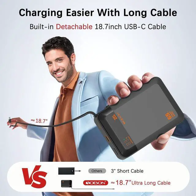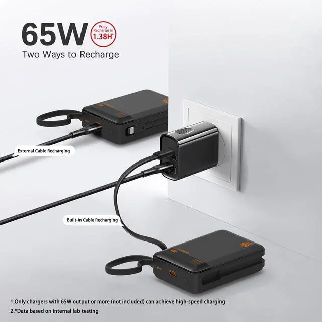 Built-in Ultra-Long & Bi-Directional USB C CableThis laptop power bank with a built-in 18.7 inch USB-C in & out cable, long enough to allow you charging your devices without picking up the power bank. This built-in USB-C cable enjoy two-way fast charging with up to 65W output and 40W input. After use, clip and pull the cable, it also can be used as a durable carrying strap to hang on your backpack for hassle-free portability, suitable for camping and travel