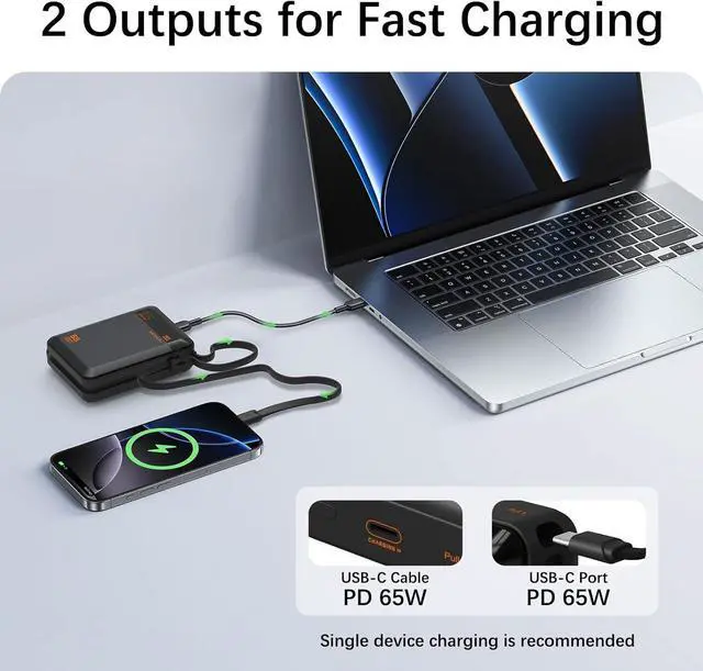 Even Wider CompatibilityThis 65W Power bank equipped with one built-int USB-C cable, one USB-C port, allowing you to power 2 devices simultaneously. (Note: Simultaneous charging may affect charging speed). This laptop battery charger widely matches with laptops like MacBook Pro, MacBook Air, Chromebook, Dell XPS, Microsoft Surface Book 2, Steam Deck. Match with tablets like iPad Pro / iPad Air / iPad / iPad Mini. Match with cell phone like iPhone 17/16/15, Samsung S23/S22/S21, and other android