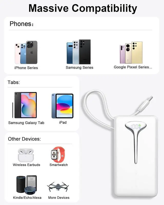 Ultra Lightweight Travel Power Bank: This compact portable charger with built in cable weighs only 192 grams, which is lighter than the iPhone 14 Pro. You can easily slip this portable phone charger into any pocket without feeling bulky. The built-in adjustable USB-C cable can be hung from a backpack or handbag for a hands-free charging experience, freeing up your hands on short trips.