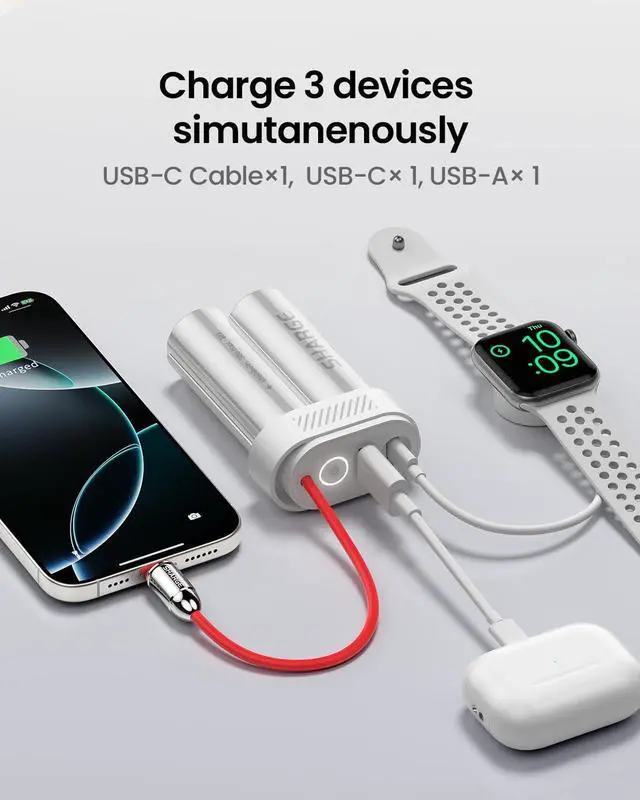 Flexible Charging for 3 Devices: Bulit-in Cable×1, USB-C port×1, USB-A port×1. The 3 in 1 power bank can charge your iPhone, iPad, and Earbuds simultaneously
