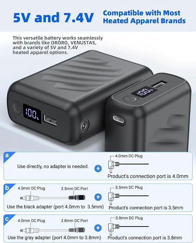 Multi-interface Adaptation Design: This battery pack is compatible with almost all 7.4V DC and 5V USB powered heated vests on the market. It features a DC 4.0 mm interface (the round plug can adapt to DC 3.5 mm/ 3.8 mm interfaces through the included conversion cable). The Type-C interface supports fast charging and discharging, but does not support DC 12V output. Compatible brands include ORORO, VENUSTAS.