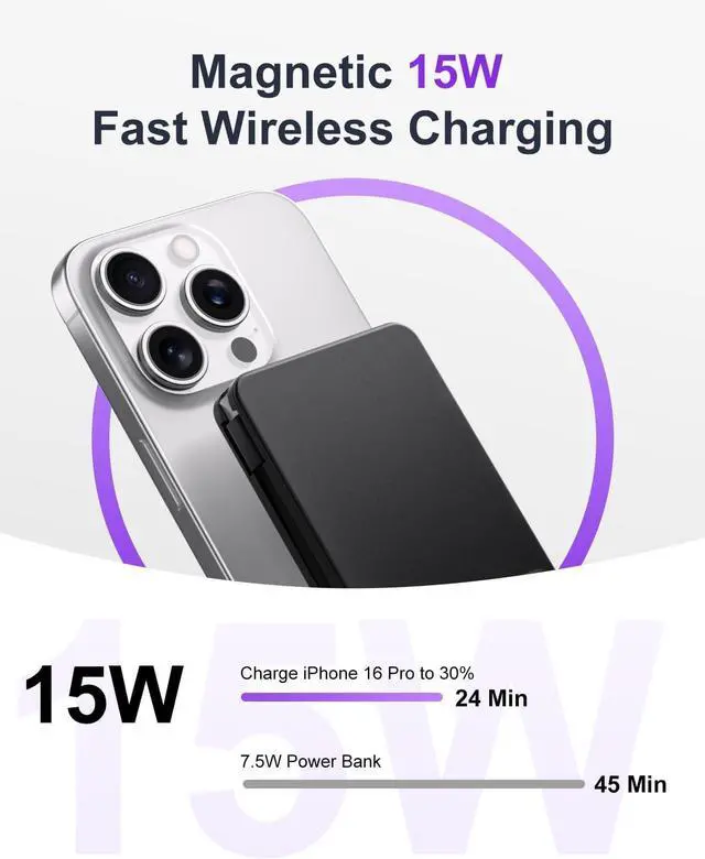 Efficient and Cool: With high efficiency and advanced temperature and battery management, this power bank offers up to 10% greater power transfer efficiency, providing not only more power for your iPhone but also operating at temperatures up to 5 lower. It can provide up to 2 full charges for an iPhone 16, perfect for daily use and travel