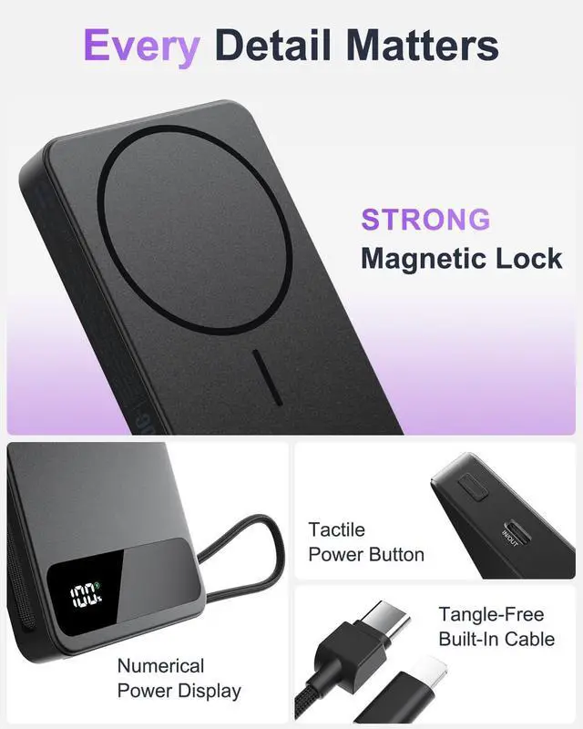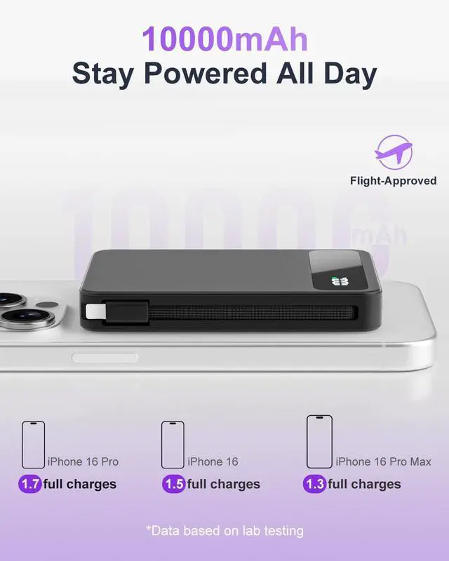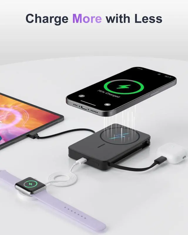 One Charger for All: With built-in USB-C/Lightning cables, this power bank allows you to charge up to 4 devices simultaneously. It is compatible with a wide range of USB-C and Lightning devices, including iPhones and USB-C Powered devices. Mag-Safe charging is compatible with the following models: iPhone Air, iPhone 17, iPhone 17 Pro, iPhone 17 Pro Max, iPhone 16 Pro Max, iPhone 16 Pro, iPhone 16 Plus, iPhone 16, iPhone 15 Pro Max, iPhone 15 Pro, iPhone 15 Plus, iPhone 15, iPhone 14 Pro Max, iPhone 14 Pro, iPhone 14 Plus, iPhone 14, iPhone 13 Pro Max, iPhone 13 Pro, iPhone 13, iPhone 13 mini, iPhone 12 Pro Max, iPhone 12 Pro, iPhone 12, iPhone 12 mini, and AirPods with MagSafe Charging Case