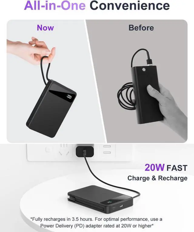 Pocket-Sized Powerhouse: This slim, card-sized Power Bank packs a powerful 10, 000mAh punch, making it ideal for travel. Built-in USB-C & Lightning cables provide 20W fast charging and recharging, eliminating the need for extra cables and simplifying your on-the-go charging setup