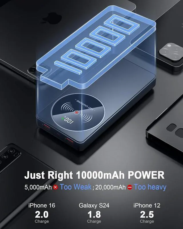 High-Capacity 10000mAh Power BankThis phone charger can recharge an iPhone 16 approximately 2 times and a Samsung S24 about 1.8 times. Enjoy peace of mind, free from battery worries! With a compact, smartphone-sized design, it easily fits in your pocket or bag, making it ideal for daily use, short trips, work, hiking, and more. Compliant with airline regulations, it is approved for carry-on travel.