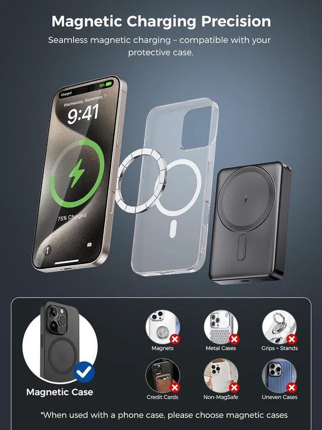 [20W PD Fast Charging + 15W Wireless] Equipped with a PD 20W USB-C port and 15W max wireless output, it charges your iPhone up to 60% in just 30 minutes. Enjoy the flexibility of wired or wireless charging - simply attach and power up instantly