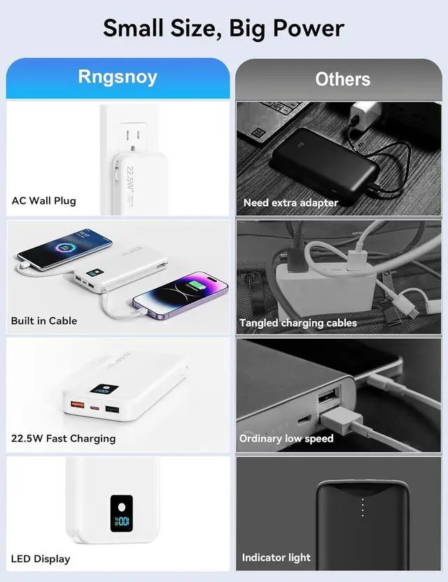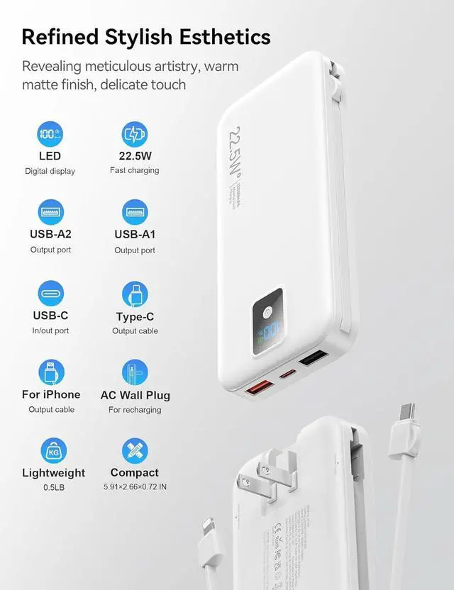 Integrated iOS cable 12W, TYPE-C cable Max 20W, plus 3 Output ports(USB-A1 Max 22.5W + USB-C Max PD 20W + USB-A2 PD 10W) with smart power-split tech makes your family row charging without spaghetti (the fast charging of the portable phone charger will be suspend while multiple devices are charging simultaneously)