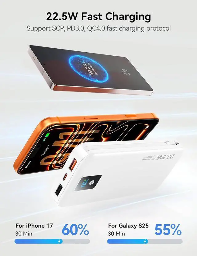 +. 12000mAh high capacity portable charger delivers 2.4 charges for iPhone 17, 2.9 charges for iPhone 17 Air, 1.2 charges for iPad Air 5, or 2.3 charges for Samsung S24. 22.5W fast charging power bank fuels your phone battery from 0% to 60% in just 30 minutes, ideal for quick top-ups during morning routines, meetings, or airport waitsno more long charging sessions