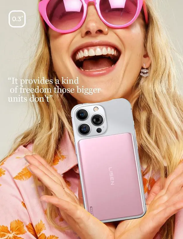 Portable Power: Meet the LISEN Ultra Slim MagSafe Power Bank-thinner than an iPhone 15 at just 0.3 inches. It' s the embodiment of mobile freedom, enabling you to carry power without the bulk. Experience the liberty of moving through your day, fully charged and unencumbered.