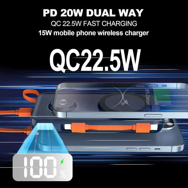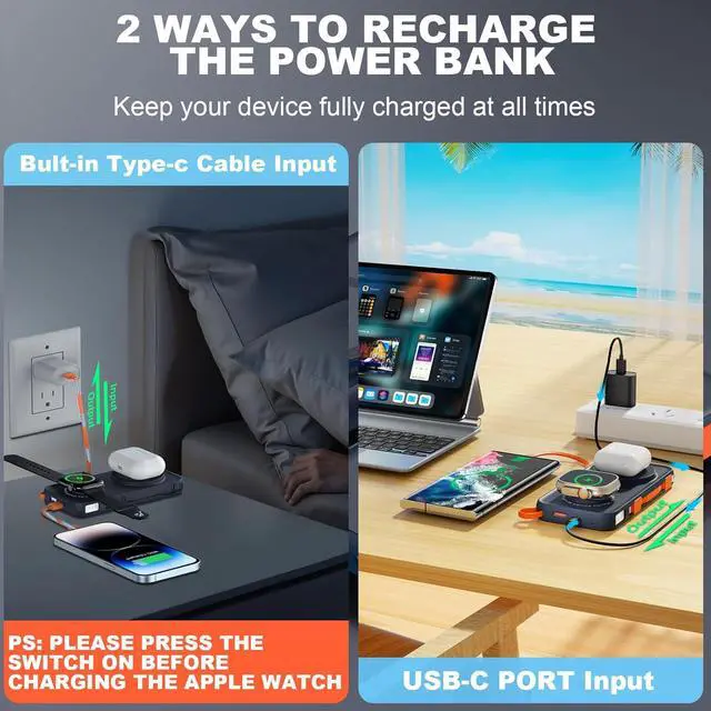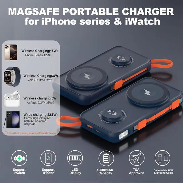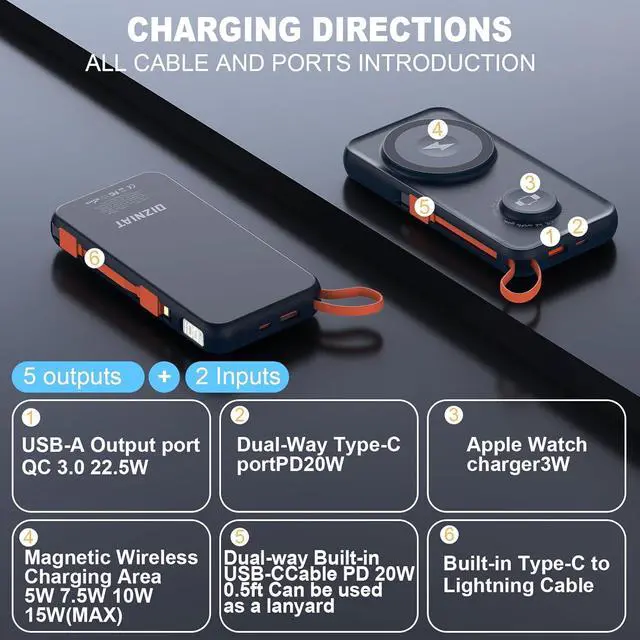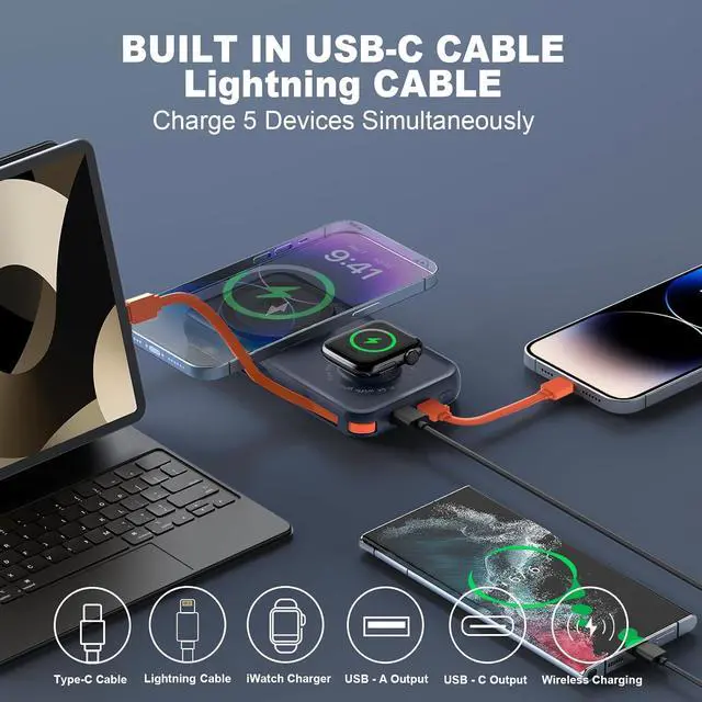 Meets All Your Charging Needs: OIZNIAT 10000mAh 5-in-1 portable charger with built in USB-C cable (You can use it as a lanyard), Qi wireless charger, magnetic wireless charger for iWatch, widely compatible with iPhone 16/15/14/13/12/11/XS/XR/SE/Pro/Pro Max, Apple Watch Ultra 2/Ultra/10/9/8/7/6/SE/5/4/3/2, AirPods and other devices.