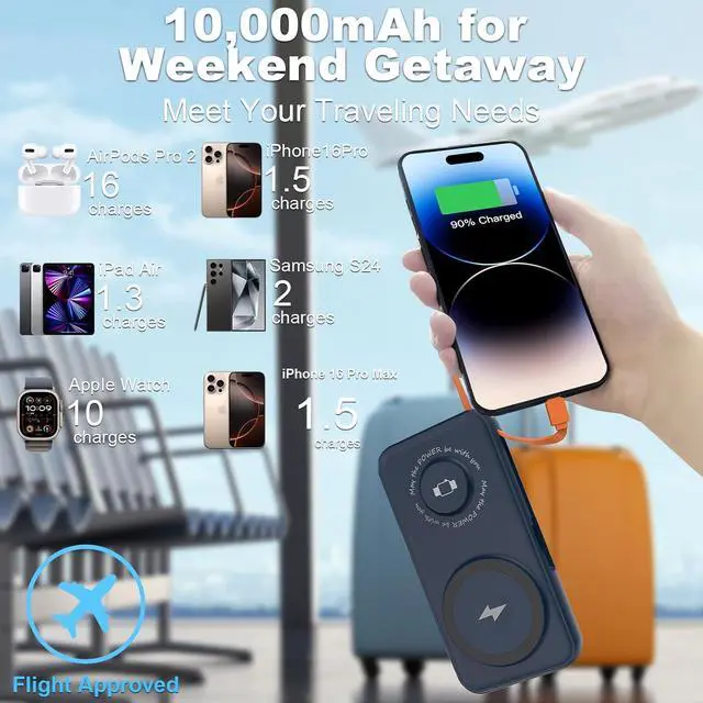High-Capacity & Fast Charging: Has a large capacity of 10, 000 mAh Travel Power Bank delivers 2-3 full charges for iPhone 16/15/14/13/12/11 and most Android phones, perfect for travel, party, hiking, camping, shopping, concerts, or international flights.. PD20W & QC 22.5W Fast Charging Power Bank refuels your devices up to 50% in 30 minutesideal for iPhone, AirPods, iPad and part Samsung users. FLIGHT APPROVED.
