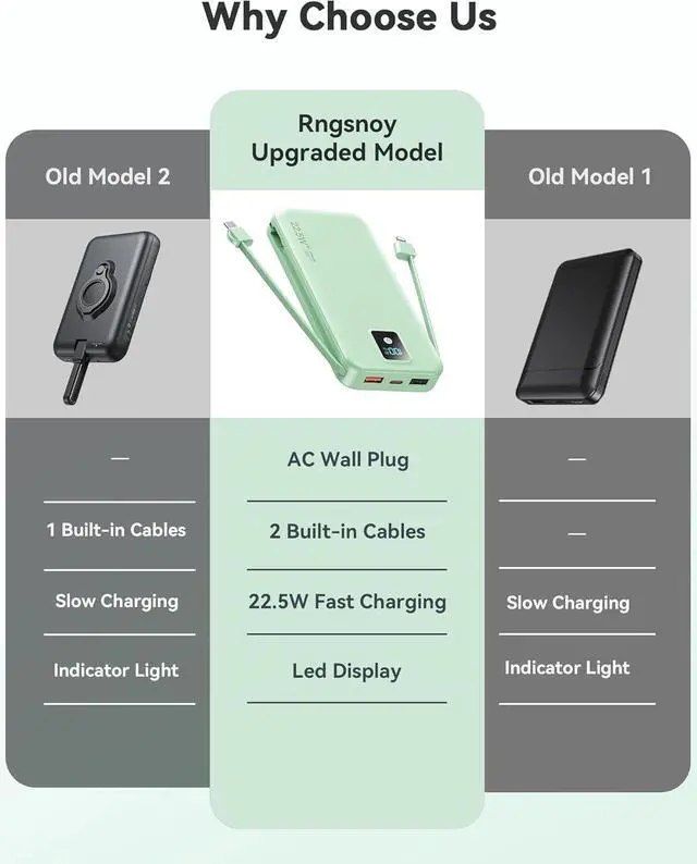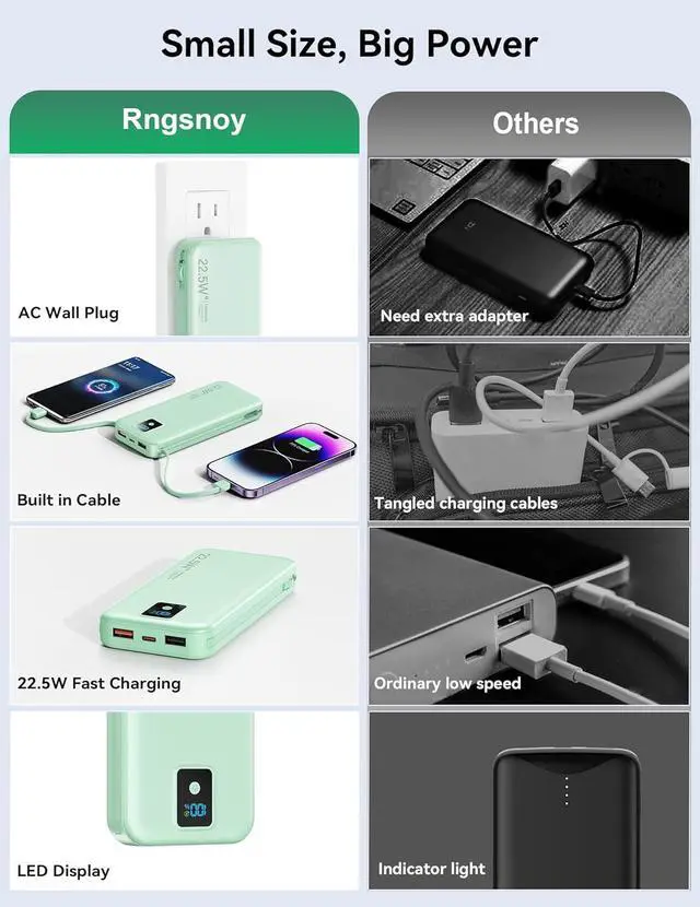 Integrated iOS cable 12W, TYPE-C cable Max 20W, plus 3 Output ports(USB-A1 Max 22.5W + USB-C Max PD 20W + USB-A2 PD 10W) with smart power-split tech makes your family row charging without spaghetti (the fast charging of the portable phone charger will be suspend while multiple devices are charging simultaneously)