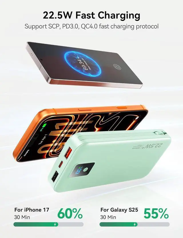 +. 12000mAh high capacity portable charger delivers 2.4 charges for iPhone 17, 2.9 charges for iPhone 17 Air, 1.2 charges for iPad Air 5, or 2.3 charges for Samsung S24. 22.5W fast charging power bank fuels your phone battery from 0% to 60% in just 30 minutes, ideal for quick top-ups during morning routines, meetings, or airport waitsno more long charging sessions