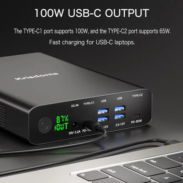 PD 3.0 100W USB-C POWER DELIVERY: Equipped with a bidirectional USB-C port which supports input and output. Krisdonia PD 100W power bank is perfect for your USB-C laptops like MacBook Pro, Chromebook, Surface Book, Dell XPS, HP, etc. Fully charge your 15" MacBook Pro 2018 in 1.5 hours.