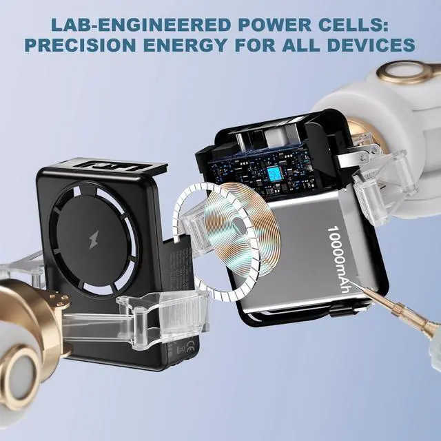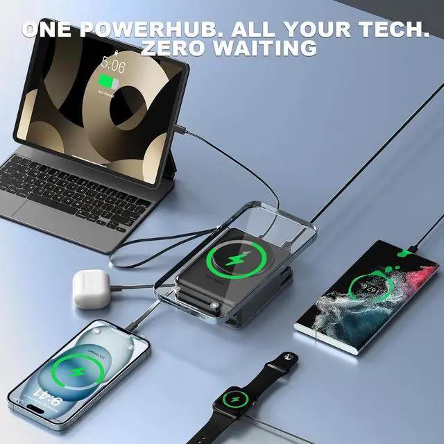 Magnetic Charging & Cable Flexibility: Seamless Magnetic Freedom magnetic power bank: Use the battery charger iPhone battery charger portable / phone battery bank to effortlessly charge devices during meetings or coffee breaks by simply snapping your phone onto the super strong magnetic charging pad portable charger magnetic. Our portable charger with built in cable, but the built in cable is replaceable, when cable extended reach is needed, smoothly swap our built-in USB-A cable with your longer USB C cable portable charger USB C / USB battery pack in seconds. Technology designed for elegance in motion. Back to school supplies portable iPhone charger / battery pack for iPhone