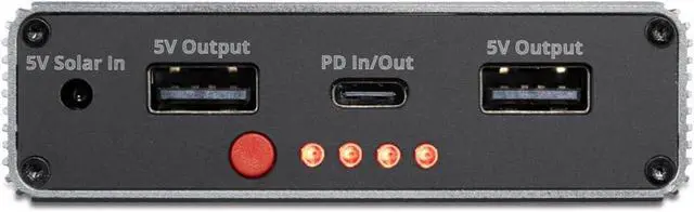 POWER OUTPUT / INPUT - USB-A Output 5V/2A, 3A max (2 ports), USBC 5/9/12V 20W PD Input / Output, 5-7V 2A Solar Input