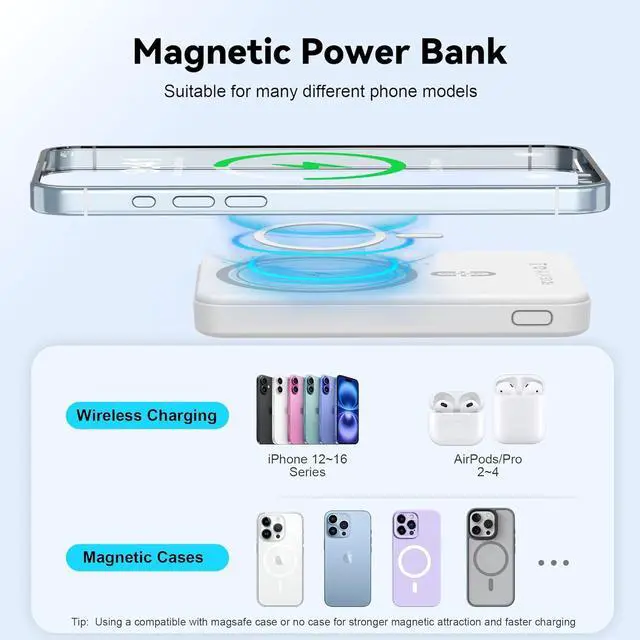 Wide Compatibility: magnetic charger for iphone, Designed for iPhone 16/15/14/13/12 series, the magnetic battery pack works with MagSafe-compatible cases or directly on MagSafe-enabled phones. The Type-C output also supports charging for a variety of non-magnetic devices with a compatible cable.