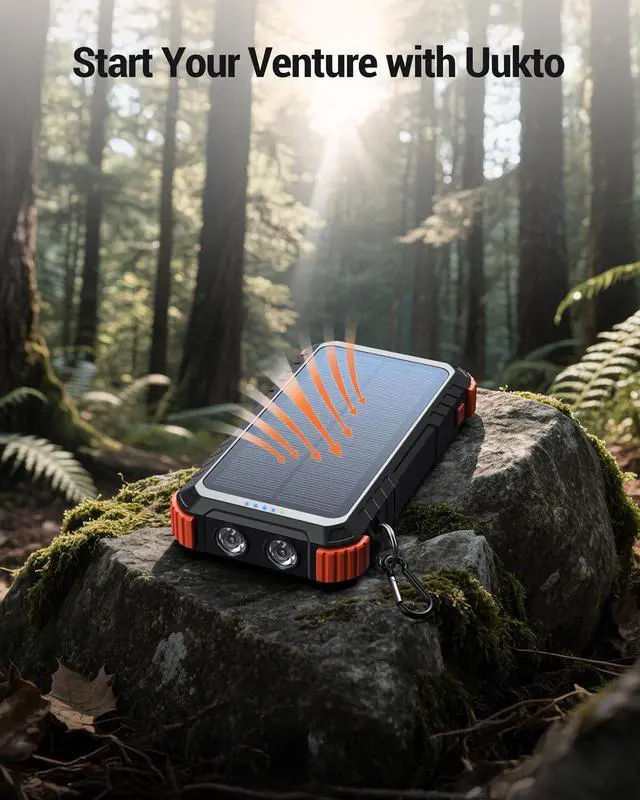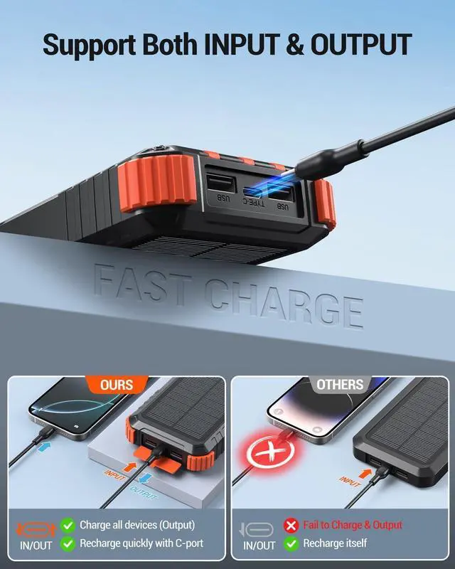 Solar charge: This solar charger power bank is designed for all outdoor explorers, and urban daily uses. Thus, its essential to have power when you are at outdoor, solar panel makes it happen, when the battery is drained out, use solar energy to fuel it back to full.