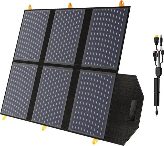 Highly Eiificient/Uperior DurablityPremium 60W portable solar panel with an energy conversion efficiency of up to 24%, Industrial-strength PET polymers and rugged polyester canvas provide lasting durability to protect against unpredictable weather conditions.