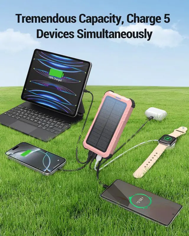 Solar charge: This solar charger power bank is designed for all outdoor explorers, and urban daily uses. Thus, its essential to have power when you are at outdoor, solar panel makes it happen, when the battery is drained out, use solar energy to fuel it back to full.