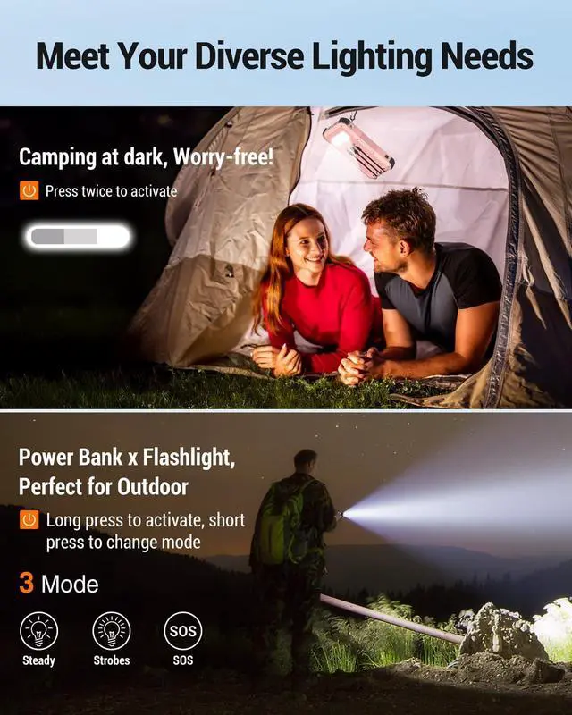 Built-in Fast Charge Cables for All Devices: The portable power bank has 3 built-in cables and 3 ports for output, especially the Type-C charging port is both for in and output, the output charging speed is faster than most of the battery packs on market. It can charge up to 5 devices simultaneously, great helper for camping, hiking, travel and outdoor activities.