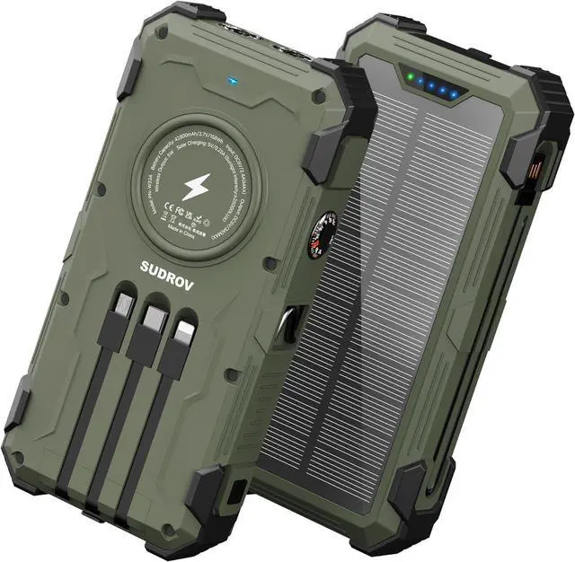 [Solar Bank with Built-in Cables] This power bank includes 3 built-in output cables (Type-C, iOS, Micro-USB) and a USB-A input cable, reducing the need for additional wires. It is ideal for charging phones, tablets, and other devices indoors or outdoors.