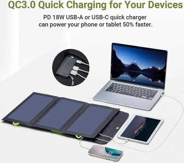 Triple Output Ports Equipped with two USB ports (USB 1: 5 V/2A, USB 2: 5 V/3A, 9V/2A, 12V/ 1.5A ) and a Type-C port supporting 18W Power Delivery for both input and output, this portable solar panel can simultaneously charge multiple devices like smartphones, tablets, and power banks. The intelligent iSolar chip technology automatically detects connected devices and sunlight intensity to optimize the power distribution, ensuring efficient and safe charging. When using multiple ports simultaneously,