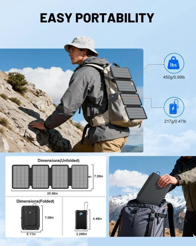 Foldable and Portable & IPX5 WaterLightweight and foldable design. When folded, it is only the size of a palm ( 7.1 × 5.1 × 1.0 in, 1lbs), easily fits into a backpack. IPX5 waterproof + dustproof. Comes with hook for hanging on backpacks or tents. Perfect for outdoor activities