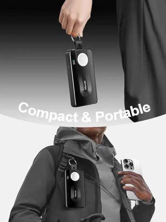 Display the product prominently in the center against a travel or commute background. Use striking icons on one side to compare charging cycles: It can charge an Apple Watch approximately 5 times or an iPhone 15 nearly 2 times. Emphasize its compact and portable size that provides immense backup power, ensuring your devices stay online all day, whether on a long trip or during daily office use.