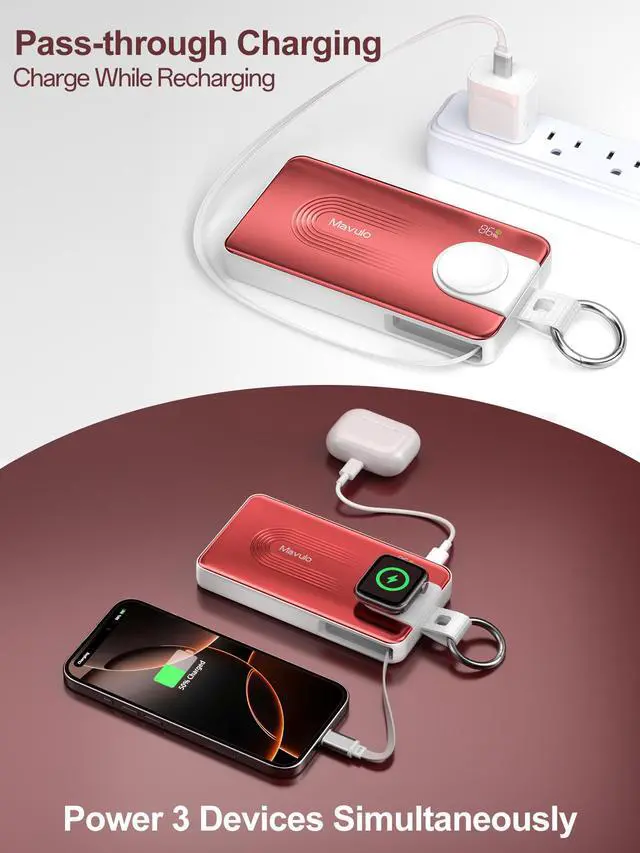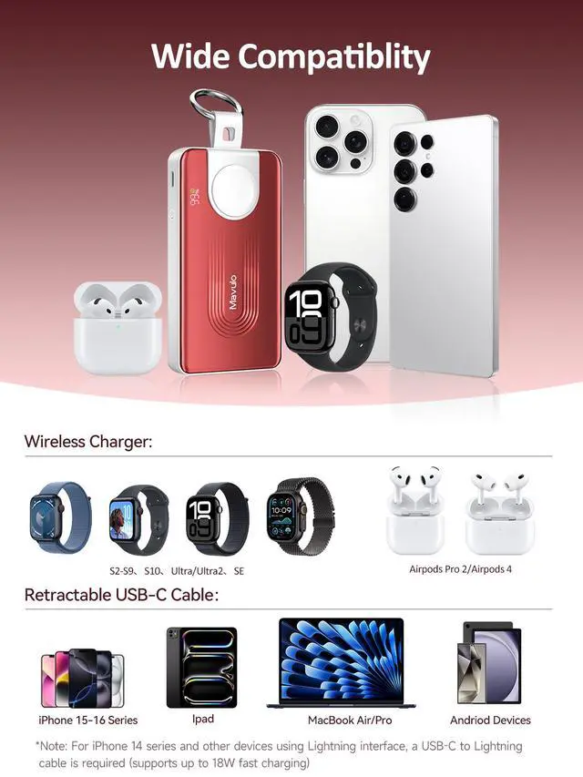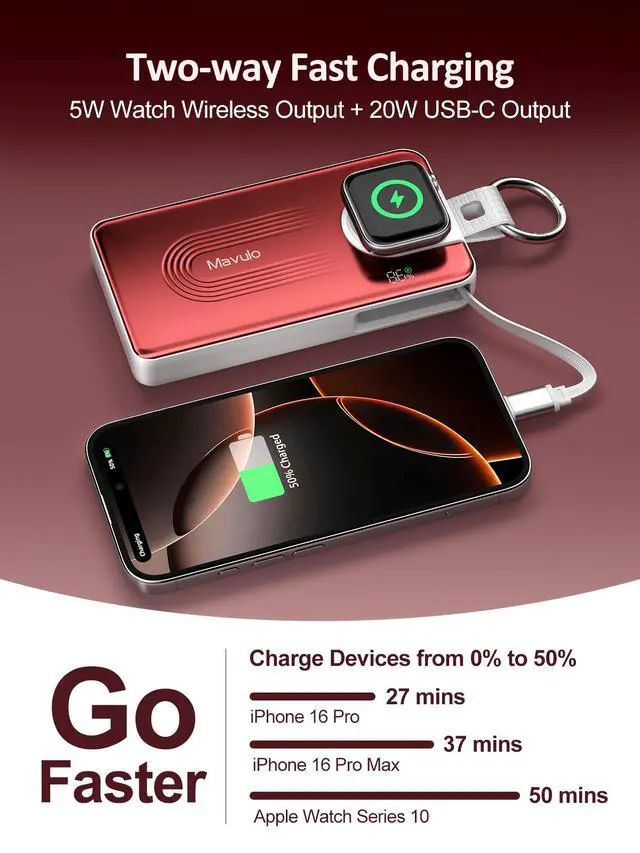 • One Device to Charge It AllThe Mavulo portable charger has a built-in magnetic wireless charger for the Apple Watch Series and a retractable Type-C cable, allowing you to charge your phone and watch simultaneously