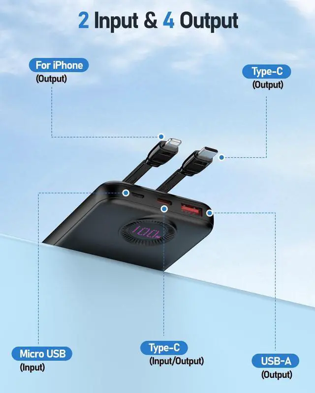 Inputs: GrnOas. E power bank builts in 2 output cables and another 2 outputs (usb a usb c) Charging for 4 Devices Simultaneously. It also builts in 2 inputs (usb c input and micro input) which you can use any one of them to recharge the external battery pack conveniently. Portable Charger with Built in