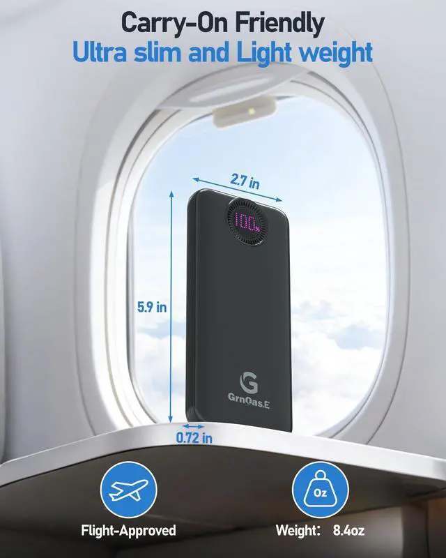 Powerful Capacity: GrnOas. E Slim Travel Charger with 5.9 x 2.7 x 0.72 in weight only 8.4 Oz convenient to carrying out for business trip or vocations good portable charger for outdoor camping.