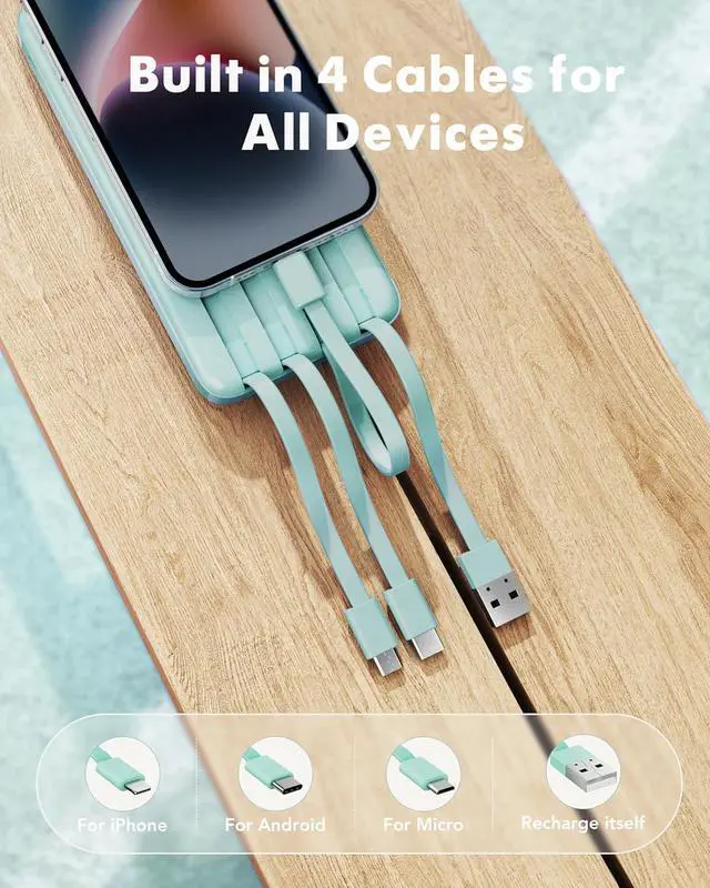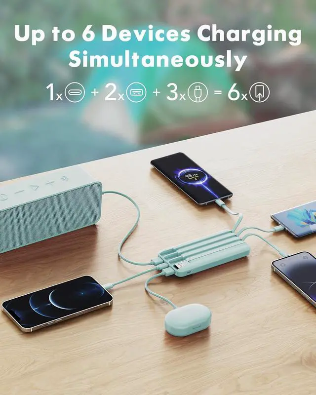 ?? Portable charger with built in cablesSlim portable charger built-in 4 cables included 3 output cables and 1 input cable. Total 3 output cables can charge almost for all types port devices. Such as for iPhone iPad for for other USB C port phones tablets and also for Micro devices. All in one portable charger you would not need to carry various cables or adapter any more!!!?? 6 Outputs and 3 InputsPortable charger has 6 outputs and 3 inputs you may charge 6 devices max at the same time recharge battery pack with 3 options easily.