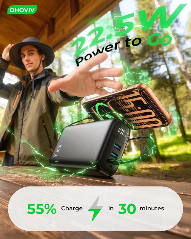 Huge Capacity 50000mAh Portable Charger - The 50000mAh power bank ultra-high massive capacity will keep your phone and other device running for many daysWithout extra worry about low phone battery. Ideal for traveling camping and hiking. Latest PD 22.5W High-Speed Charging - OHOVIV 50000mAh Portable phone charger adopts the latest Super Charger Protocol and Fast Charger Protocol with 22.5W output USB-C port. Support QC 4.0 QC 3.0 huge capacity power bank with fast charging it only takes 30 minutes to charge your iPhone 14 from 0% to 55%.
