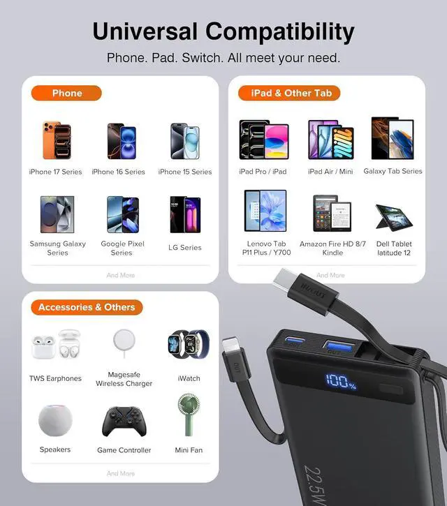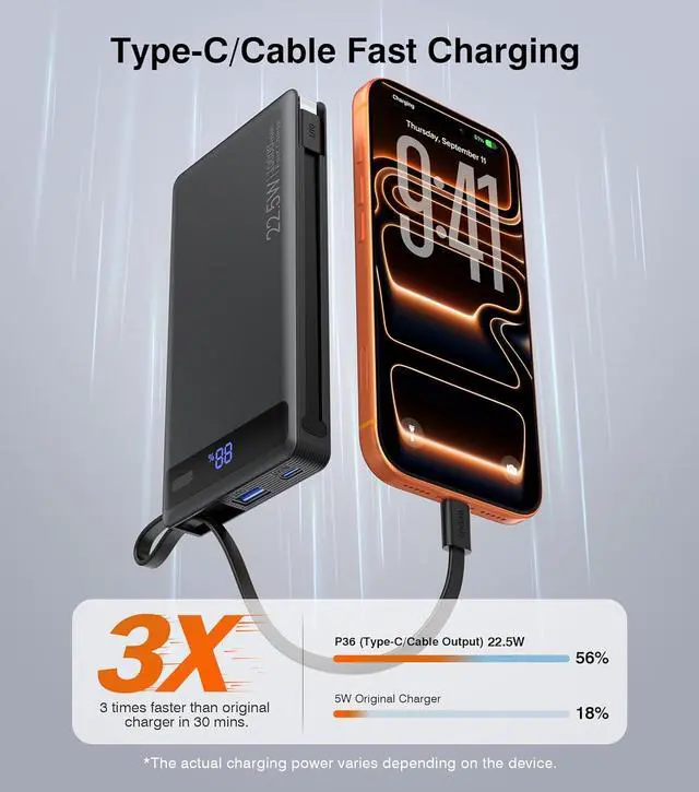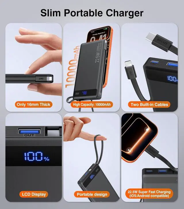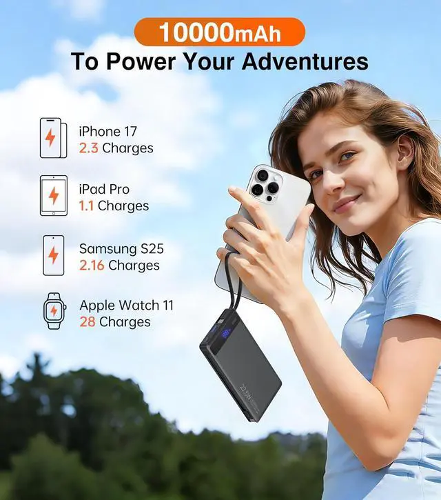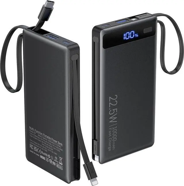 10000mAh 22.5W Ultra-Fast Charging & Smart LCD DisplayExperience 22.5W ultra-fast charging with broad compatibility for iPhone Android and devices via PD and QC protocols. Ideal for rushed mornings or on-the-go use it delivers a quick power boost to save you time. The intelligent LCD display lets you monitor the remaining battery capacity at a glance. Built-in Cables & Dual Ports for 4-Device Simultaneous ChargingEquipped with two integrated cables (Type-C and Lightning) plus an additional USB-C port and a USB-A port this power bank can charge up to four devices at once. The cables slide out effortlessly for immediate use and retract neatly into the body when not needed eliminating tangles for true grab-and-go convenience.