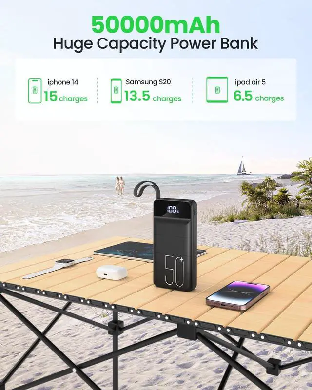 Power Bank: The 50000mAh portable charger ultra-high massive capacity charging bank provides 15 charges for iPhone14 13.5 times for S20. Depending on battery size most smartphones will get over 10 full charges. Suitable for camping hiking fishing vacation travel and other outdoors activitiesLatest PD 22.5W