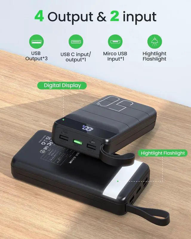 Super Fast Charging: 50000mAh battery bank adopts the latest Super Charger Protocol and Fast Charger Protocol with 22.5W output USB C port. Support QC 4.0 +PD 4.0 high-capacity power bank with quick charging it only takes 20 minutes to charge your iPhone 15 from 20% to 60% which is 3 times faster than most ordinary old power bank 10W power banks on the marketMultiple Charging Ports 4 Outputs and 3
