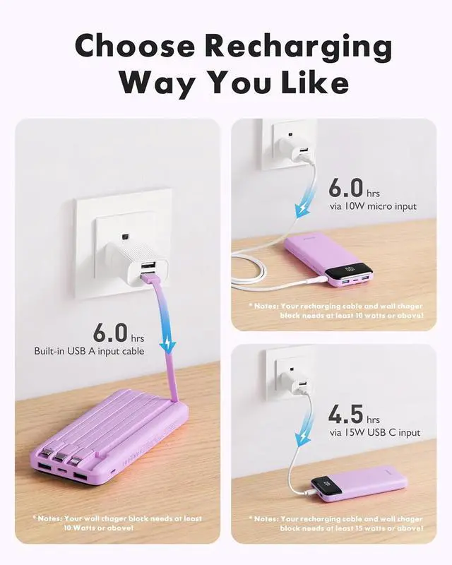 ?? Portable charger with built in cablesSlim portable charger built-in 4 cables included 3 output cables and 1 input cable. Total 3 output cables can charge almost for all types port devices. Such as for iPhone iPad for for other USB C port phones tablets and also for Micro devices. All in one portable charger you would not need to carry various cables or adapter any more!!!?? 6 Outputs and 3 InputsPortable charger has 6 outputs and 3 inputs you may charge 6 devices max at the same time recharge battery pack with 3 options easily.