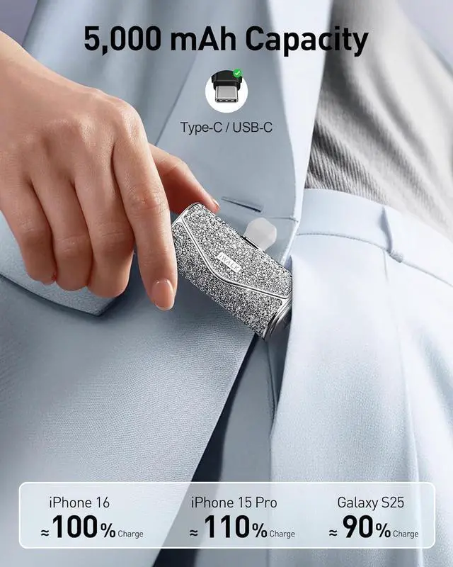 What You Get: iWALK 5000 mAh 1x Sparkly Portable Phone Charger 1x USB-C to USB-C Cable 1x Manual and friendly customer service