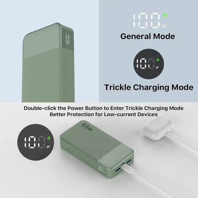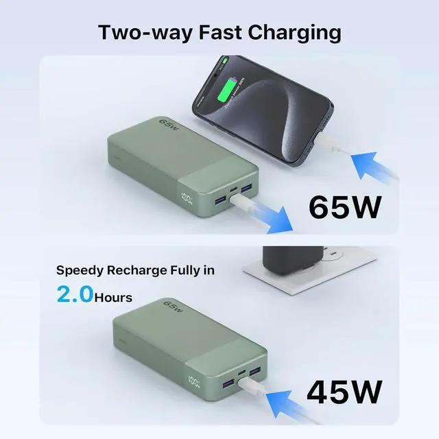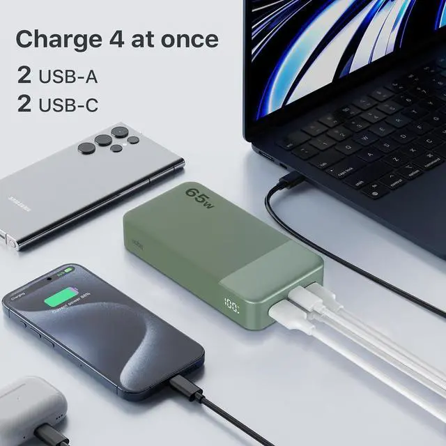 65W Bi-Directional Fast Charging This portable charger features 65W high-power PD fast charging swiftly topping up your laptop and other devices. It also supports 65W input for rapid self-recharging minimizing downtime for the power bank itselfVersatile 4-Port Simultaneous ChargingEquipped with 2 USB-C and 2 USB-A ports it can charge multiple devices at once. Whether for business trips or outdoor entertainment it can handle it all with just one device eliminating the hassle of insufficient power outletsUniversal Compatibility This power bank offers extensive compatibility with most laptops smartphones tablets and gaming devices. Specially optimized to deliver fast stable charging for various laptop models it serves as your reliable power source for both work and play20000mAh High Capacity This 20000mAh battery pack power bank delivers extended power for laptops phones and tablets.