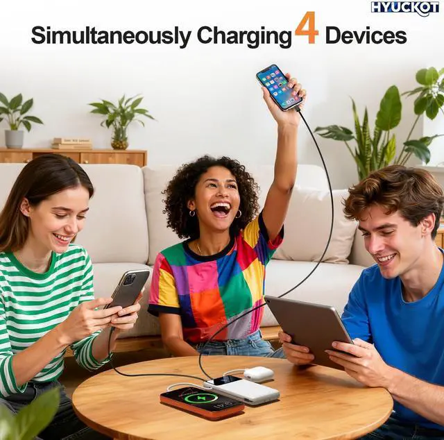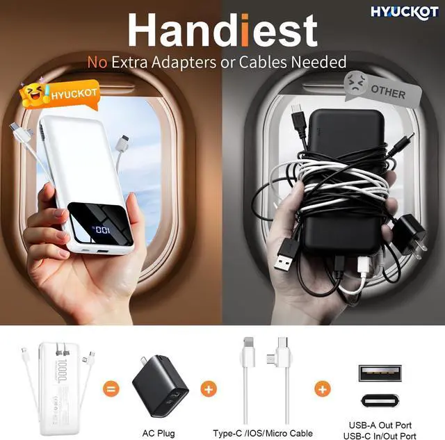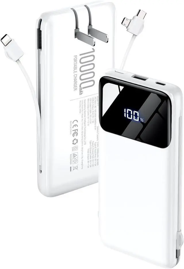 [All-Inclusive Portable Charger Built-In Cables + Foldable Wall Plug] Say goodbye to messy cords and multiple chargers. This plug-in power bank features a foldable AC plug that lets you recharge it directly from any wall outletno extra adapter required. With three integrated cables (USB-C IOS Micro cable) plus additional output ports it delivers a true grab-and-go charging experience for your devices. [Charge Up to 4 Devices at Once Up to 15W Efficient Fast Charging] Built for multi-device users the all-in-one portable charger power bank lets you power up to 4 devices at the same time using built-in cables a USB-C port and a USB-A port.