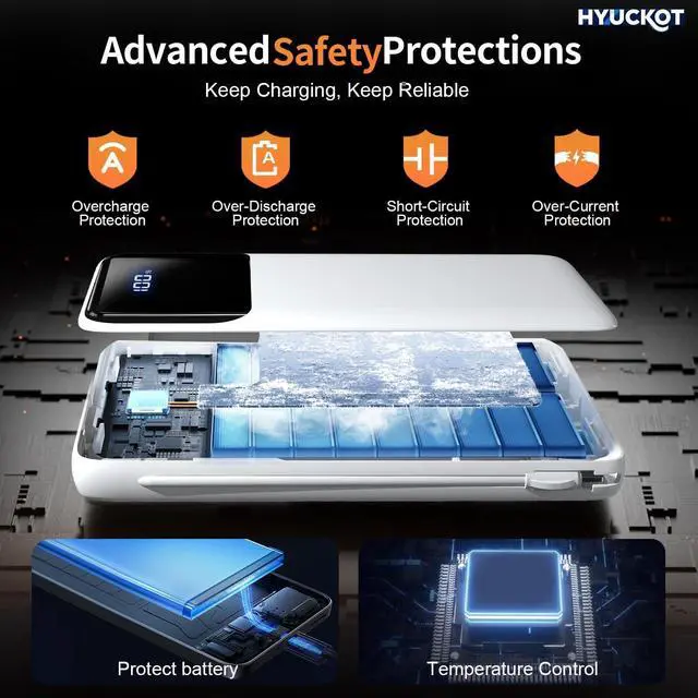 [Intelligent LED Display & Multi-Layer Safety Protection] Smart LED percentage indicator gives an accurate read of your remaining power so you can plan ahead and keep your devices ready when it matters most. Equipped with advanced safeguards against over-voltage over-current over-temperature short circuits and over-discharge. This system protects your devices and extends the power bank's lifespan. [What You Get] 1× Portable Charger with built-in charging cables and wall plug; 1× User Manual; Round-the-Clock 24/7 Support.