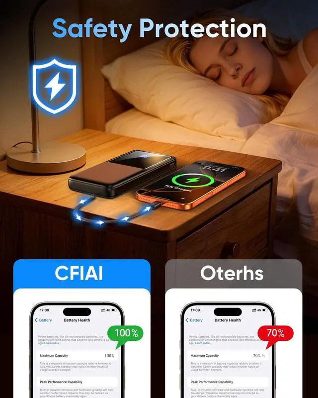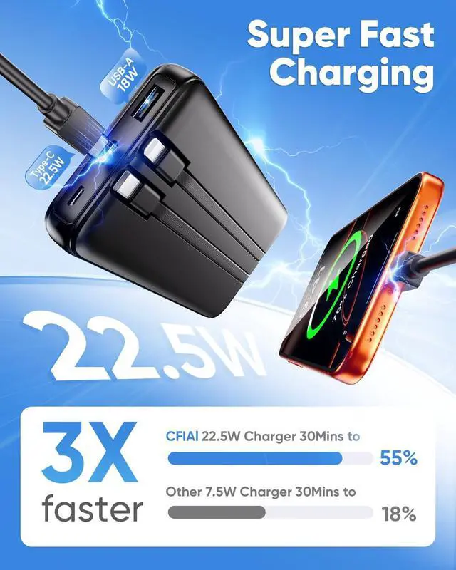 Charging Battery Pack >>>: CFIAI portable phone charger combines the most advanced PD & QC fast charging technologies the USB C cable supports PD 22.5W iOS cable supports 20W USB C port supports 18W USB A port support 15W. Incredibly fast charging fuels your iPhone 15 from 0 to 50% in 30 mins nearly 3X faster than original chargers. Get rid of the anxiety of low battery no more waiting around for a full battery! Meet Your Multiple