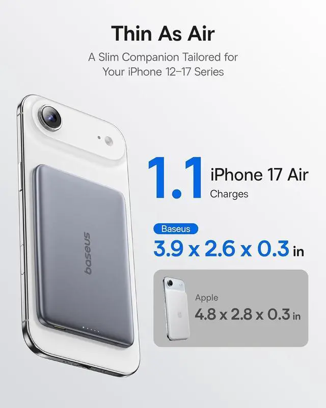 Ultra-Slim Ultra-Light Ultra-Portable: Baseus magsafe portable charger with a razor-thin 0.3 in profile and a feather-light 3.8 oz design lighter than your iPhone. The 5000mAh power bank for iphone can slip seamlessly into your pocket bag or even wallet the ultra-slim build ensures youll barely notice its there until you need instant power on the go.?? The Second Battery of