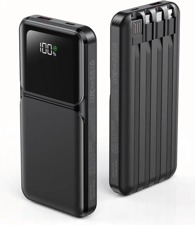 Portable Charger with Built in CablesSlim USB C 10000mAh power bank has 4 built in cables (iOS Type C USB Micro) and 3 Charging port Widely compatible with almost all types smart devices such as for iPhone 17/17 Pro/16/16Pro/15/15 Plus/15 Pro/15 Pro Max S23 S22 S21 S20 Google Pixel Android iPad Tablet and more. We use high quality materials to ensure the durability tear resistance and bend resistance of this power bank with built in cables. (Airline-approved)USB C and iOS Fast Charging Power BankThe 10000mAh Multiple port Power Bank with built in USB C( 22.5W ) and iOS (20W) Output cables have QC 4.0 & QC 4.0 fast charge technologies can charge mobile phone at a maximum 3 times faster than conal chargers.