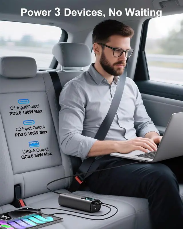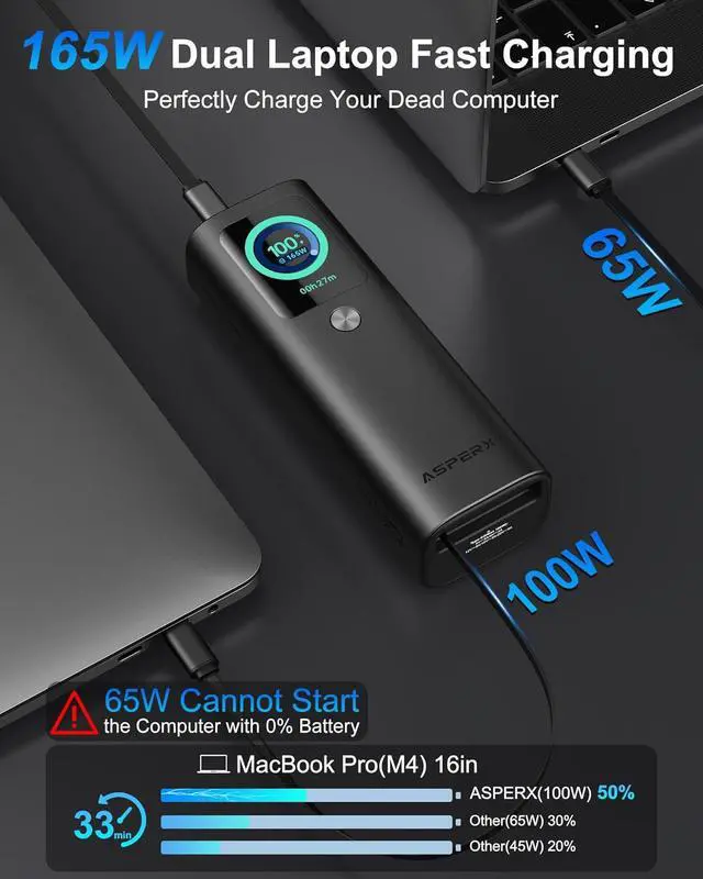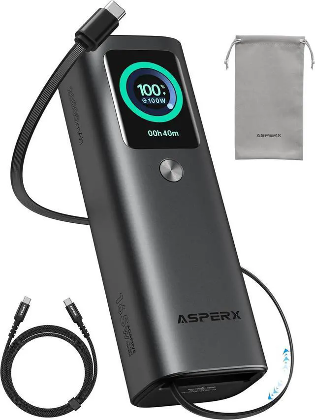 All-Day Battery Life: Charge your laptop phone and devices for 24+ hoursideal for work hikes or cross-country flights. 165?????????????????????????????????????? -??????????????: AsperX portable charger power bank adopts the latest chip solution which can provide 165W charging speed and the maximum single port can reach 100W. AsperX laptop power bank can provide 100W and 65W fast charging for two computers at the same time. It can significantly improve the charging efficiency and feel the speed of technology.???????????????????????????????????????????????? -??????????: AsperX stands among the elite 1% of brands using genuine aluminum alloy casing not cheap plastic with metallic paint. Experience the difference with our military-grade metal shell that delivers luxury tactile 40% heat dissipation more than plastic alternatives extended battery lifespan for both your devices and power bank plus consistently stable fast charging - all engineered to protect your valuable gadgets while looking exceptionally sleek.???????? -????????????????????????????: AsperX power bank for laptops features the largest colorful display currently available. Real-time display of battery level remaining time output/input power and battery information to let you feel the charm of technology at all times. Adjustable screen brightness to let you have the best experience indoors and outdoors.??????????????????????????????????????????????: We have solved the problem that small power products cannot be used such as small power fans headphones smart watches etc. You only need to long-press the power button to enter Small Power Mode which is perfectly adapted.????????????????????????????: Enjoy peace of mind with our industry-leading 24-Month comprehensive protection covering defects in materials & workmanship.
