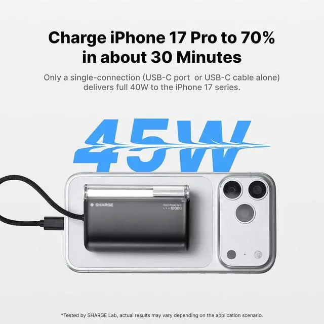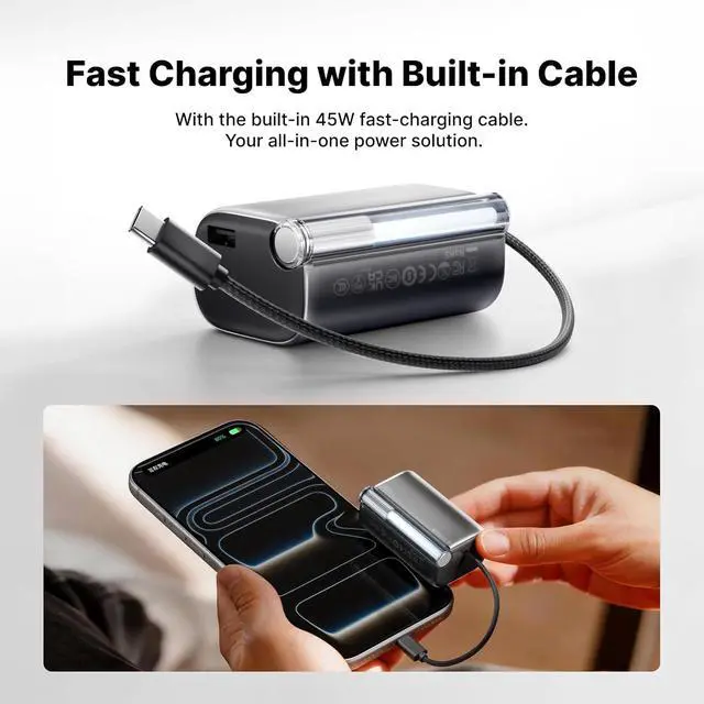 The 10000mAh power bank provides dependable power for your devices. It can charge an iPhone 17 up to 2 times an iPad Air up to 1.6 times or a DJI Pocket 3 up to 3.8 times making it a powerful battery pack. Built-in USB-C Cable Grab& Go Charging No extra cables needed. This power bank with USB-C cable allows instant charging anytime making this portable charger perfect for commuting travel and everyday carry. Star-trail LED Indicator Stylish semi-transparent design with a flowing LED light that clearly indicates charging status. Lab-Tested to Meet Global Standards Test reports verify compliance with CCC CB UL FCC CE UKCA UN 38.3 RoHS and PSE.