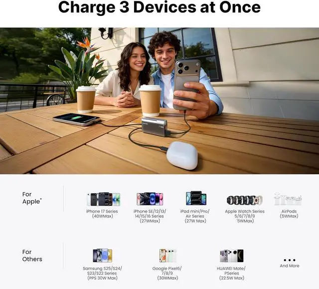 45W Fast Charging This power bank fast charging delivers up to 45W output providing rapid charging for smartphones and USB-C devices. It can charge an iPhone 17 Pro from 0 to 70% in about 30 minutes making it a reliable portable phone charger for busy schedules. Compact Size 60% Smaller Design Designed with a space-saving structure this small portable charger is 60% smaller than the iPhone 17 Pro Max. It is ideal for flights commuting travel and everyday use making it one of the most practical travel essentials. 10000mAh High-Capacity BatteryAirline-Safe Capacity & CCC Certified for Carry-On Use.